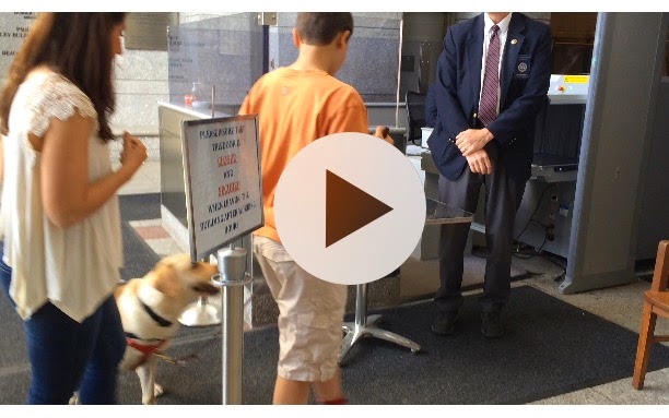 The focus of our training session with Helen this afternoon was on practicing passing through a metal detector and having Bo wanded with a hand held metal detector by a stranger. This training is in preparation for going through airport security. We conducted our session at our local federal court building. We chose to schedule our first session at the end of the day when it would be less busy. We introduced ourselves to the security personnel and explained what we where there to do and asked for their permission to pass through the metal detector for training purposes. The employees were incredibly welcoming and helpful. Bo did have a reaction to being wanded that was captured on video. Helen talked Austin through handling the reaction and Bo recovered. We did not remove his vest, harness, leash and collar, so the metal detector was NOT turned on when it was moved over his body. (It would have alarmed due to all the metal and we wanted him to experience the wand on his body separate from the sound of it alarming. We exposed him to the sound of the detector going off at the end of the session.) When we go through airport security we will remove his equipment and put on a slip lead without any metal parts.