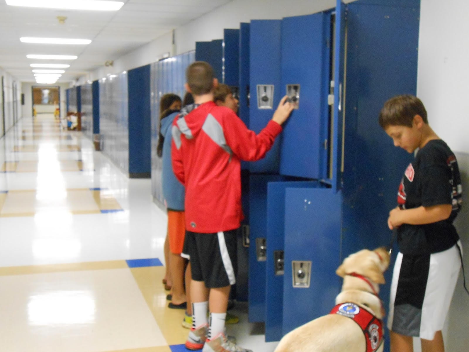 Austin practiced handling Bo at the lockers outside his classroom. Helen asked half the class to pretend to put away and take out books from the lockers, while the other half of the class looped walking past Bo and Austin. Again, Bo did excellent with this exercise. He stayed focused on Austin and was not bothered by the distraction of the kids walking past him and around him.